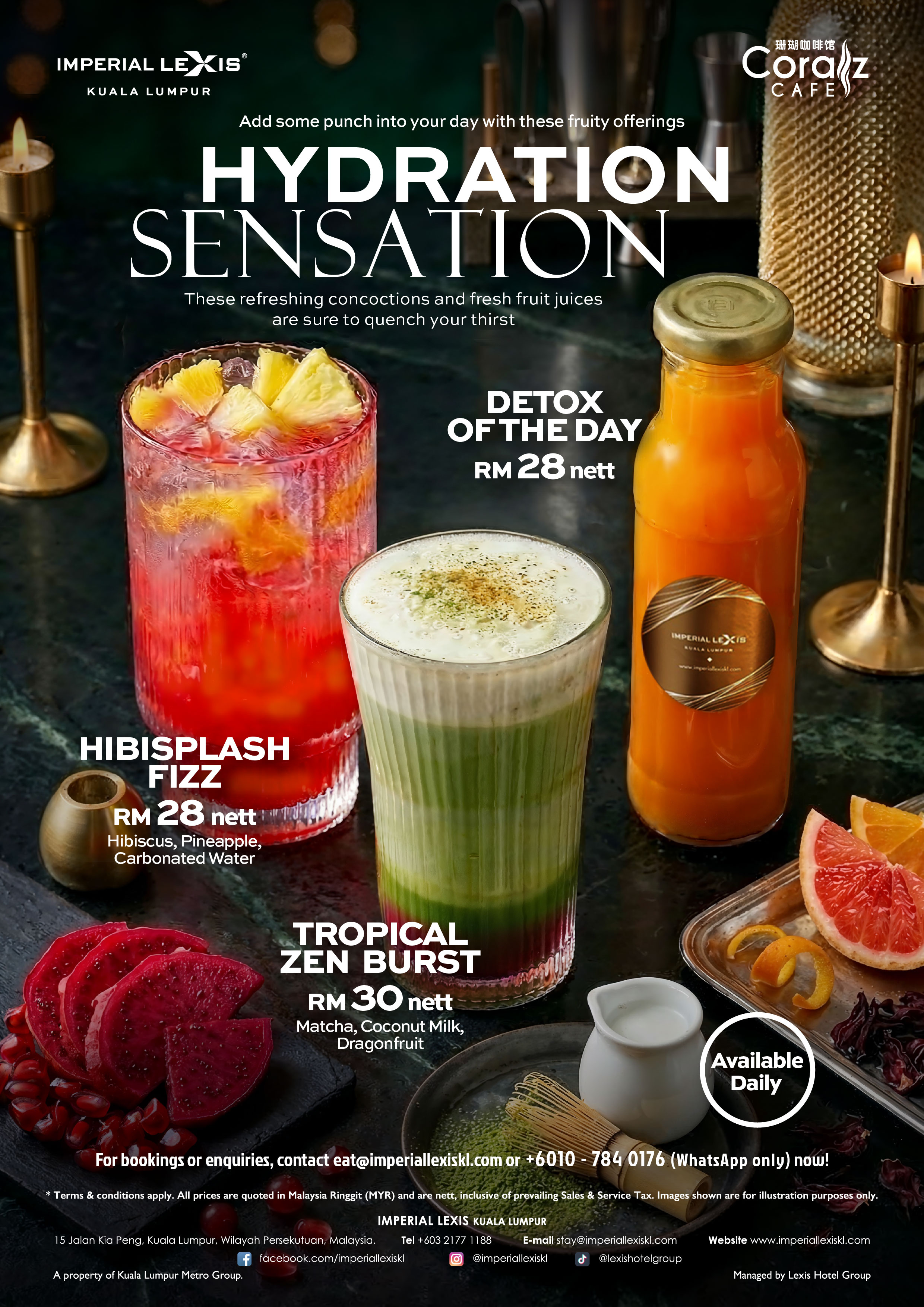 Brighten your day the refreshing way at Coralz Café, Imperial Lexis Kuala Lumpur. Crafted for health-conscious guests who crave flavour without compromise, our vibrant lineup of fruit-forward refreshers delivers hydration with a delicious twist. Sip the Tropical Zen Burst with soothing matcha, creamy coconut milk and antioxidant-rich dragonfruit, sparkle up with the tangy Hibisplash Fizz, or rejuvenate with our citrus-packed Detox of the Day.