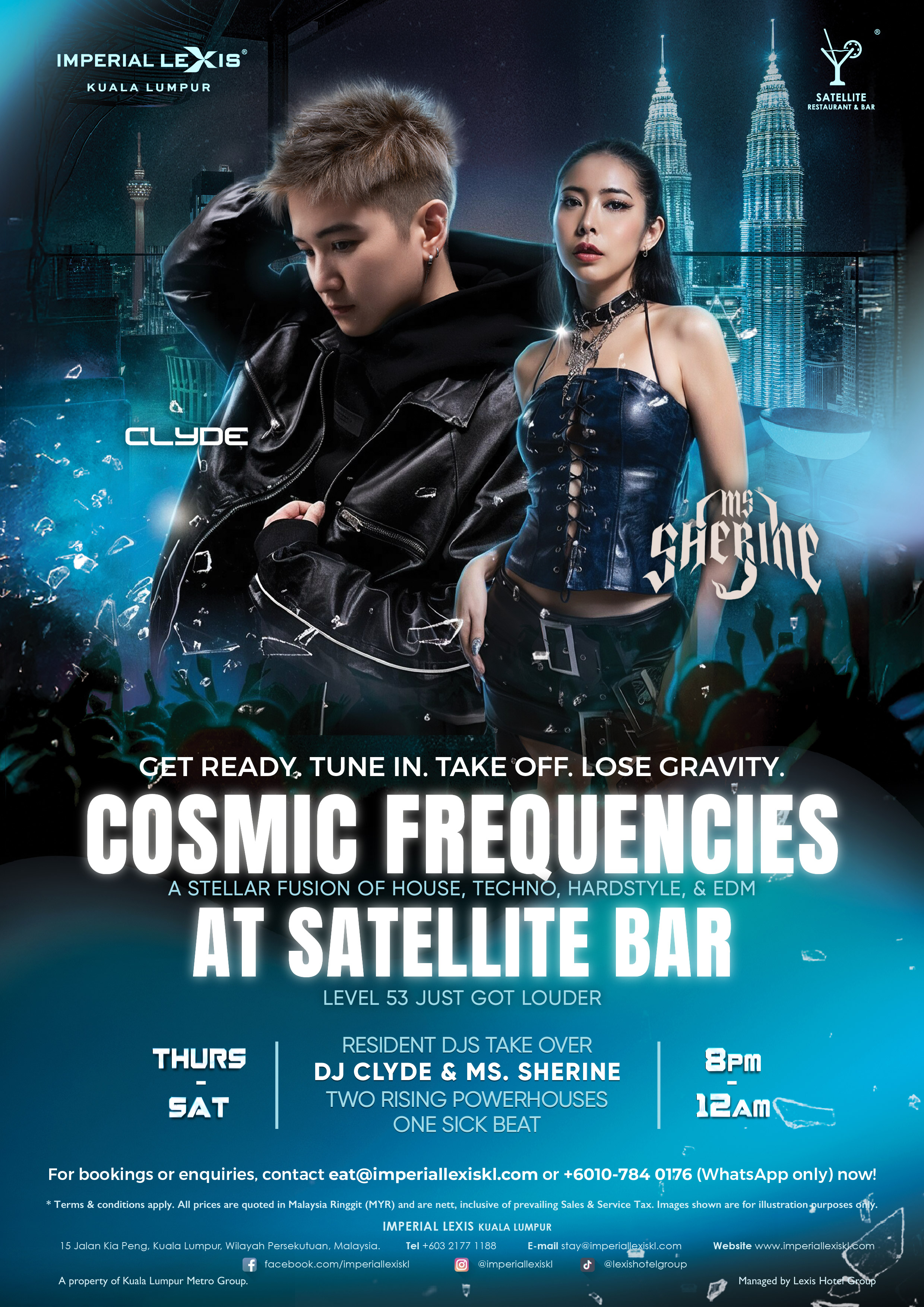 High above the city on Level 53, Satellite Restaurant & Bar at Imperial Lexis Kuala Lumpur ignites the night with its electrifying resident DJs, DJ Clyde and Ms. Sherine. Every Thursday to Saturday from 8pm to 12 midnight, tune into cosmic frequencies as these two rising powerhouses deliver a high-voltage blend of house, techno, hardstyle and EDM, set against an unbeatable KL skyline. As the beats rise, gravity fades and the rooftop transforms into an elevated dancefloor in the sky.