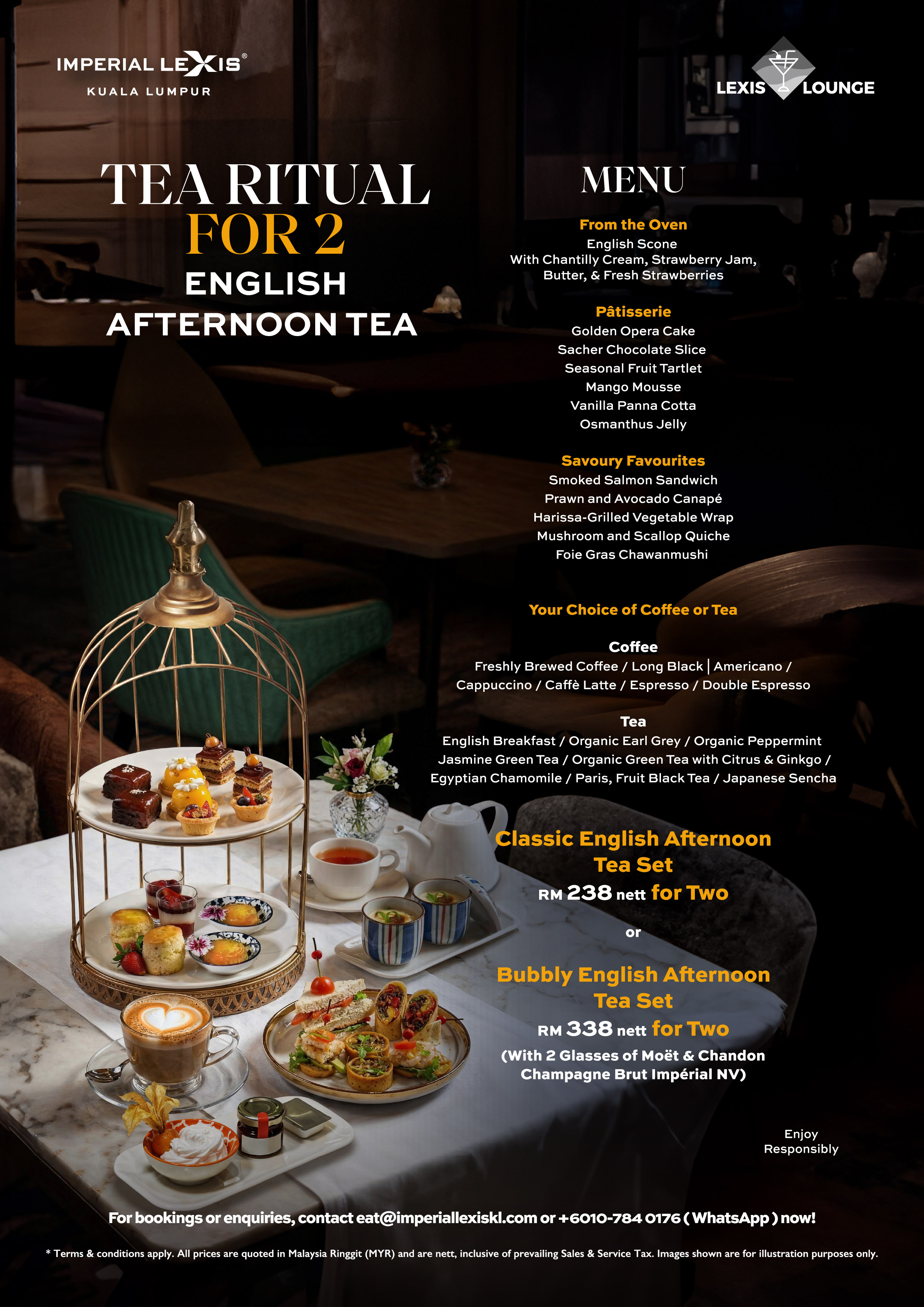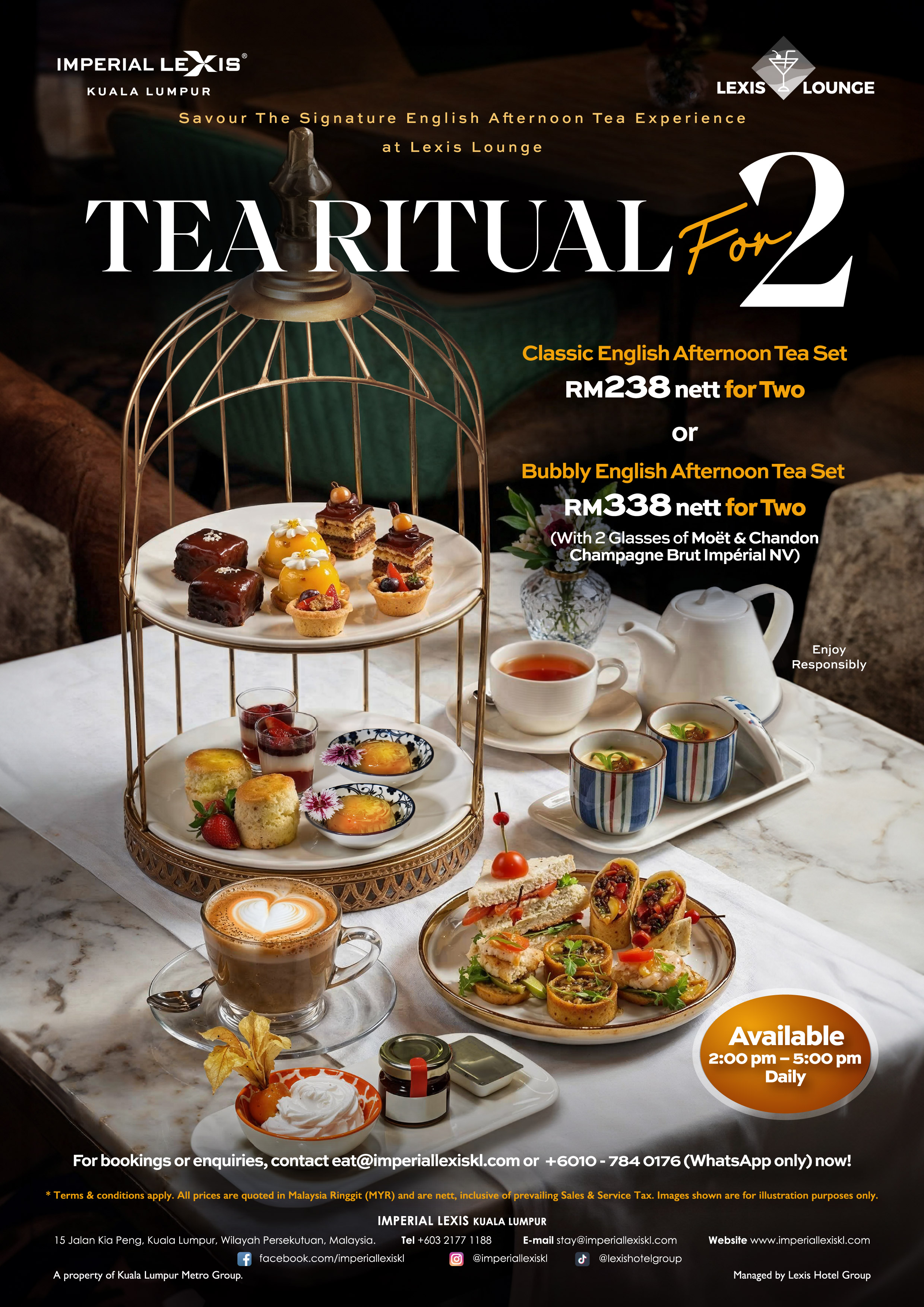 Step into an exquisite afternoon at Lexis Lounge with Tea Ritual for Two, the signature English afternoon tea experience at Imperial Lexis Kuala Lumpur. Available daily from 2:00 pm to 5:00 pm, indulge in delicately crafted pâtisserie, savoury favourites, warm English scones, and your choice of premium tea or coffee. Choose the Classic English Afternoon Tea Set at RM238 nett for two, or elevate the occasion with the Bubbly English Afternoon Tea Set at RM338 nett for two, including two glasses of Moët & Chandon Champagne Brut Impérial NV.