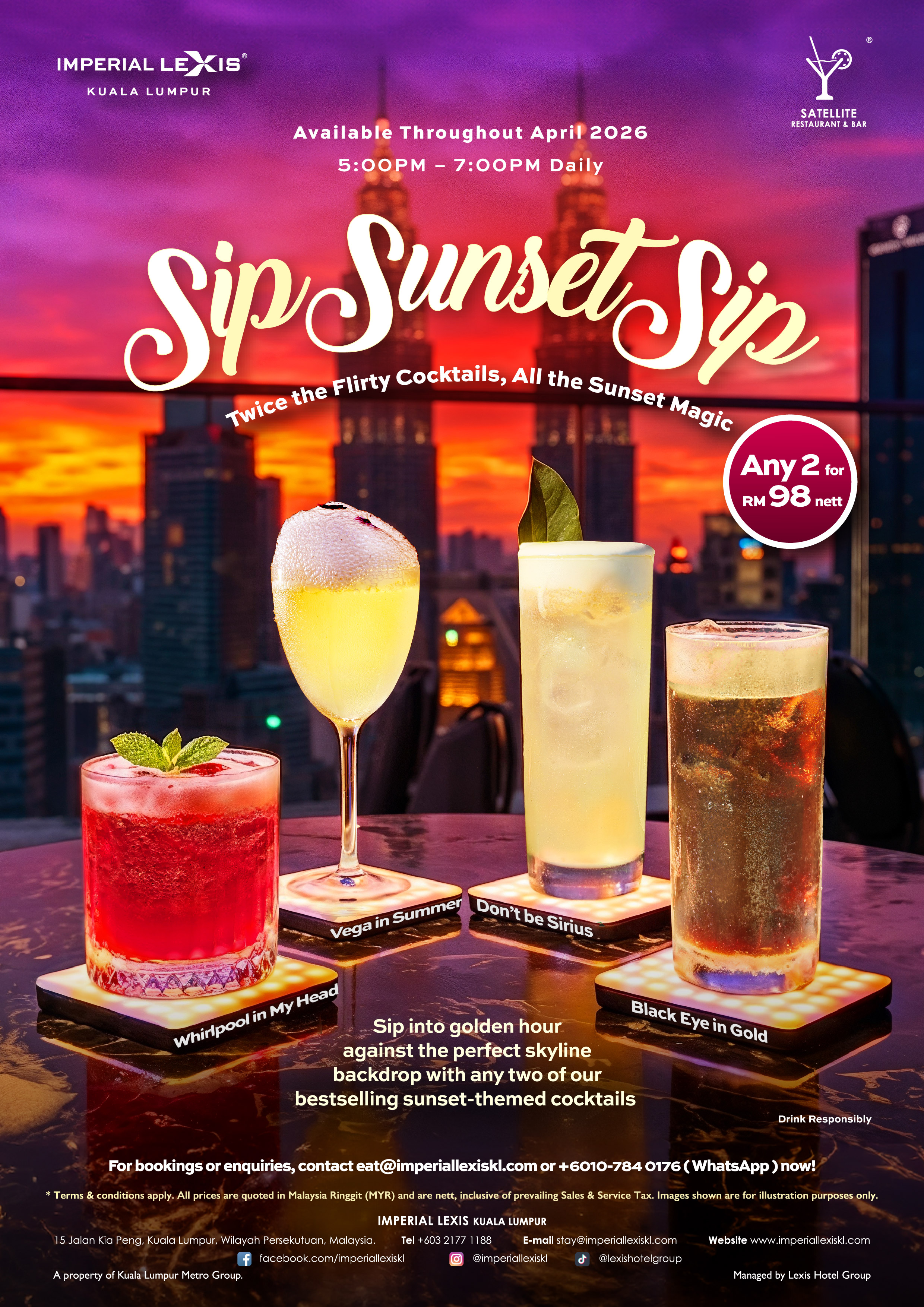 Turn golden hour into your happiest hour this April at Satellite Restaurant & Bar, Imperial Lexis Kuala Lumpur. Set against one of the city’s most breathtaking skyline views, this irresistible sunset special lets you enjoy any two bestselling sunset-themed cocktails for only RM98 nett, daily from 5:00 pm to 7:00 pm throughout April 2026. Choose from Whirlpool in My Head, Black Eye in Gold, Vega in Summer and Don’t Be Sirius, then sip, sway and soak in the rooftop magic as the sun goes down.