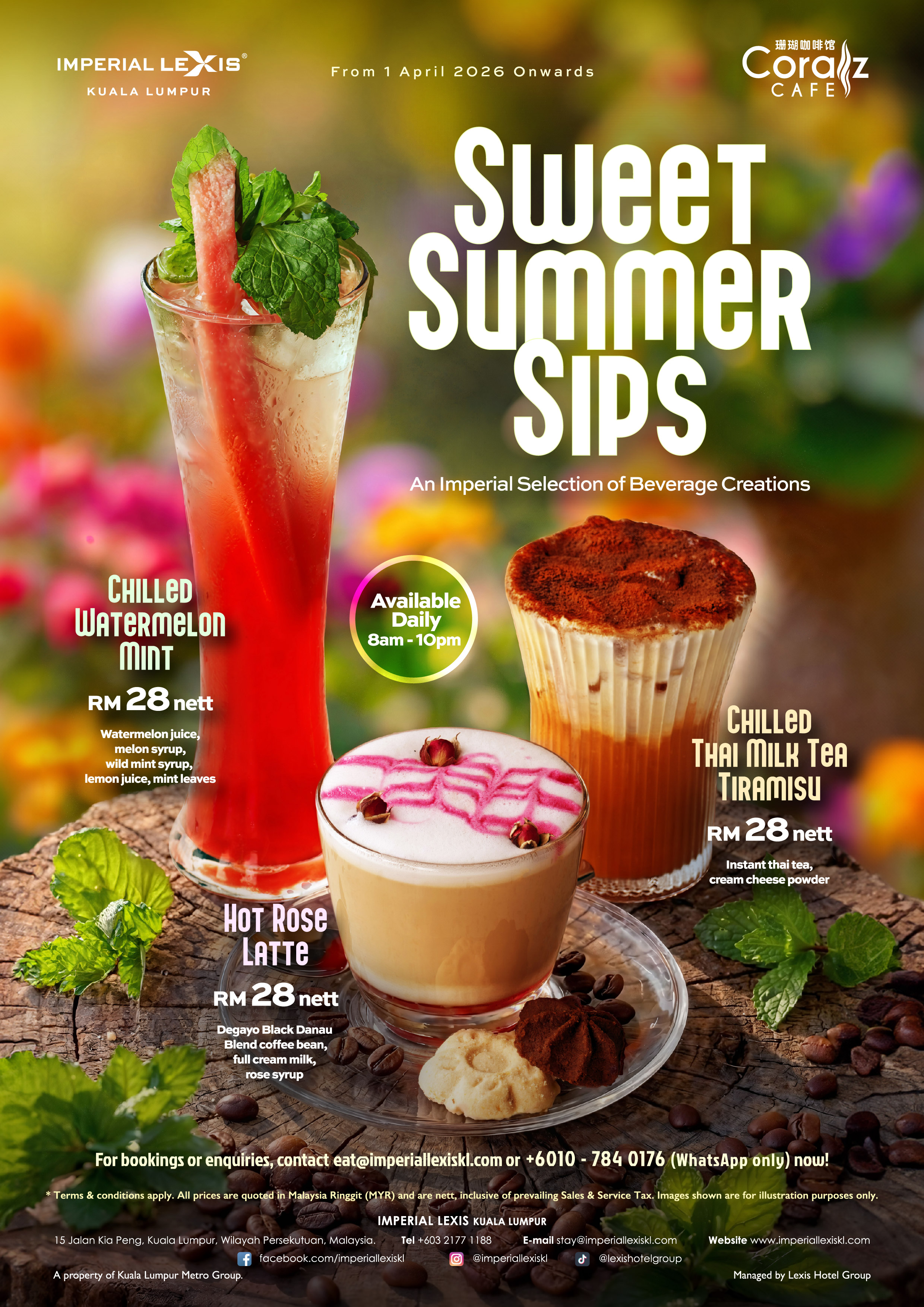 Cool down in style with Sweet Summer Sips at Coralz Café, Imperial Lexis Kuala Lumpur. From 1 April 2026 onwards, enjoy a refreshing trio of crafted beverages at just RM28 nett each, served daily from 8:00 am to 10:00 pm. Indulge in the luscious Chilled Thai Milk Tea Tiramisu, sip on the floral charm of the Hot Rose Latte, or revive your senses with the vibrant Chilled Watermelon Mint. Perfect for morning pick-me-ups, midday breaks or evening wind-downs, these irresistible creations are made to refresh, replenish and delight.