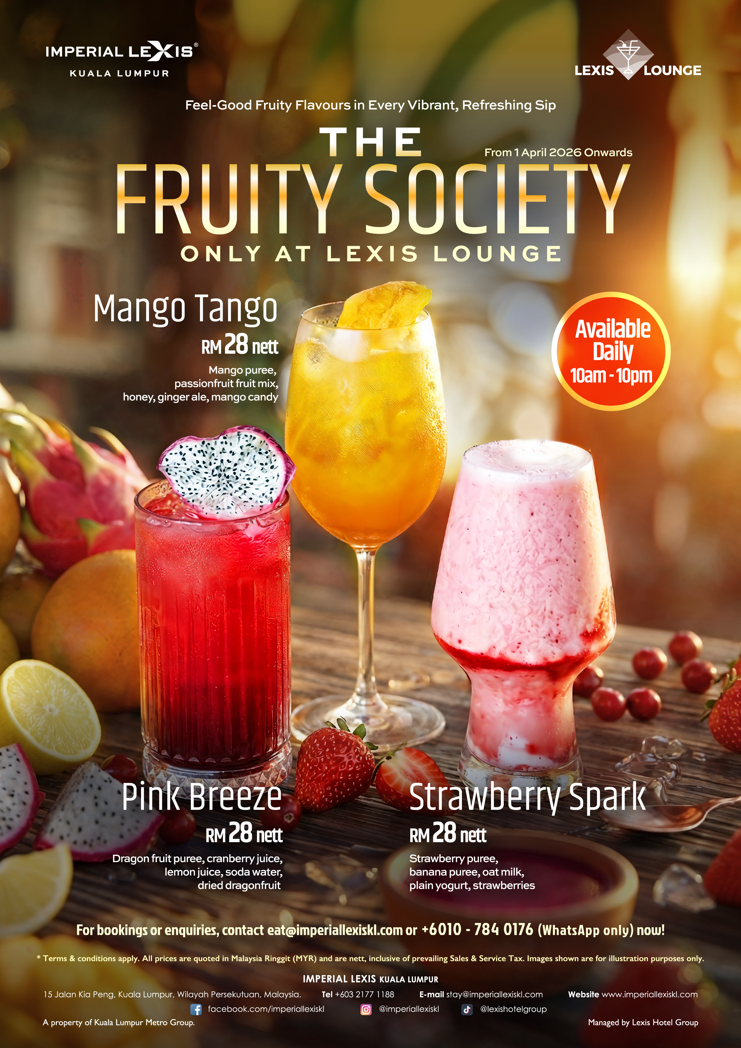Join The Fruity Society at Lexis Lounge, Imperial Lexis Kuala Lumpur, and sip your way into a world of refreshing indulgence from 1 April 2026 onwards. Priced at just RM28 nett each, this irresistible trio of vibrant creations is crafted to brighten every moment, whether you crave the tangy allure of Pink Breeze, the tropical charm of Mango Tango, or the creamy sweetness of Strawberry Spark. Available daily from 10:00 am to 10:00 pm, these feel-good fruity favourites are made for leisurely afternoons, catch-ups and indulgent pick-me-ups.