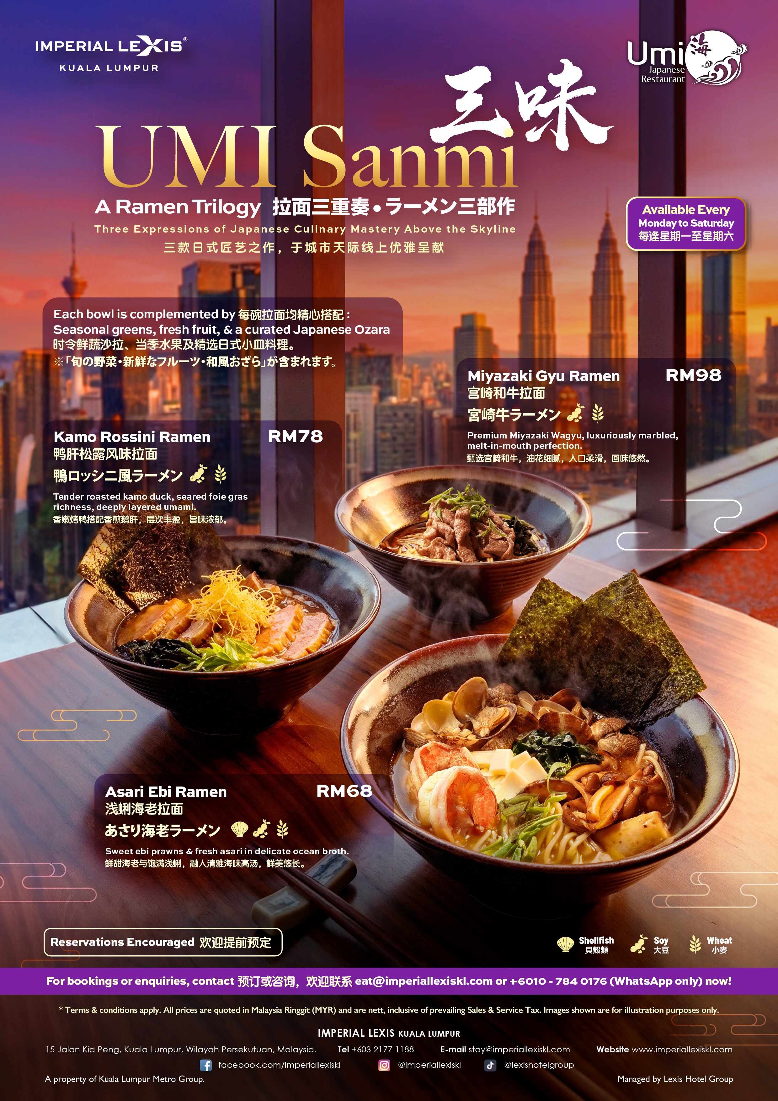 Ascend to UMI Japanese Restaurant on level 52, and discover “UMI Sanmi 三味: A Ramen Trilogy” — three refined expressions of Japanese culinary mastery, served above Kuala Lumpur’s breathtaking skyline. Savour the ocean-kissed elegance of Asari Ebi, the indulgent depth of Kamo Rossini with seared foie gras, or the exquisite richness of premium Miyazaki Wagyu. Each bowl is thoughtfully complemented with seasonal greens, fresh fruit, and a curated Japanese side for a complete, elevated experience. Available all day during operating hours, Monday to Saturday.