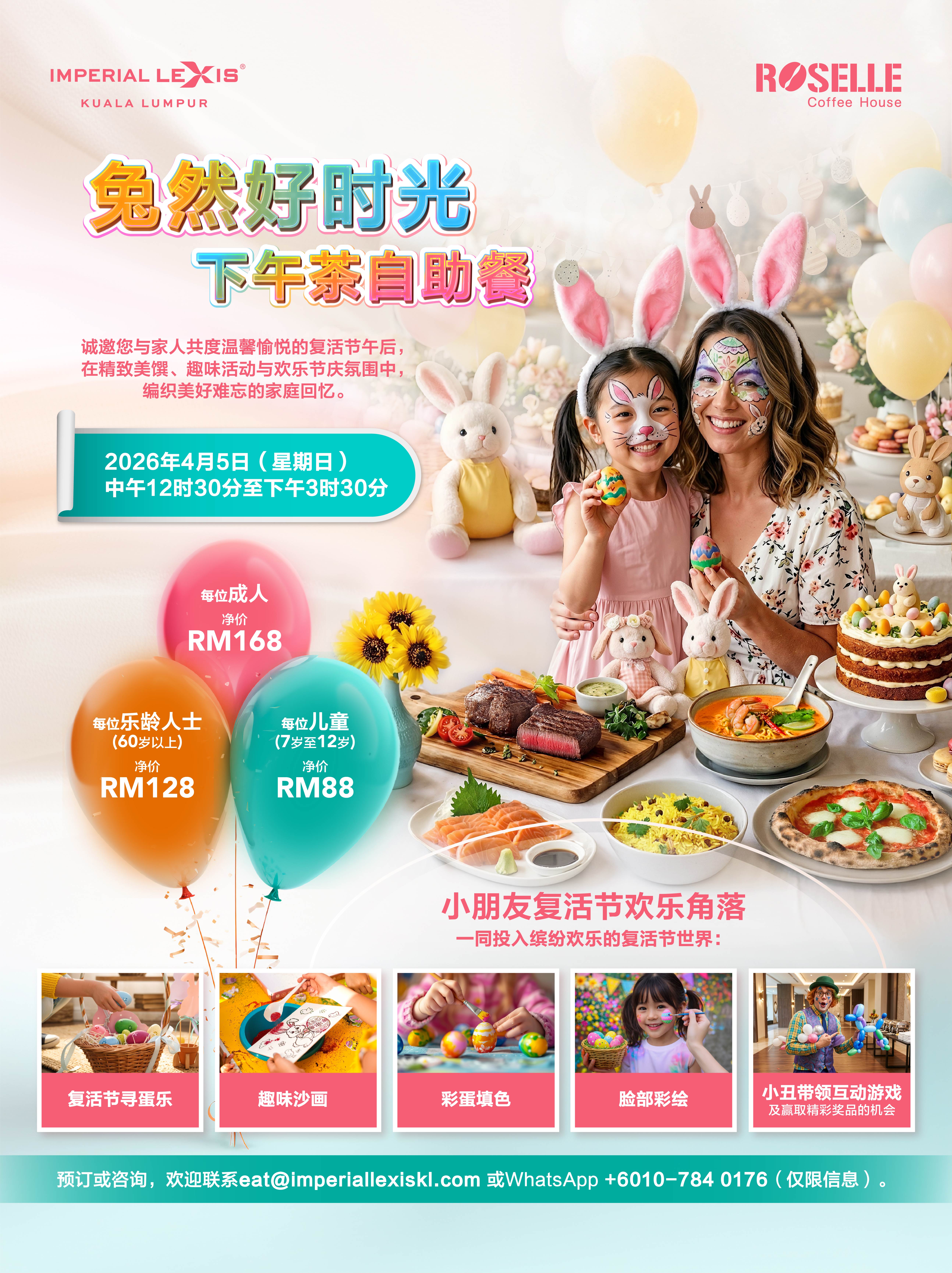 这个复活节,诚邀您与家人齐聚吉隆坡帝国豪华酒店的大红花餐厅,于温馨愉悦的午后时光中,共享一场精致丰盛的节庆飨宴。2026年4月5日(星期日)中午12时30分至下午3时30分,尽情享用「兔然好时光下午茶自助餐」,在琳琅美馔与欢乐氛围中,缔造珍贵家庭回忆。小朋友还可于复活节欢乐角落参与寻蛋乐、趣味沙画、彩蛋填色、脸部彩绘及小丑带领的互动游戏,更有机会赢取精彩奖品。成人每位净价RM168、乐龄人士每位净价RM128、儿童每位净价RM88。