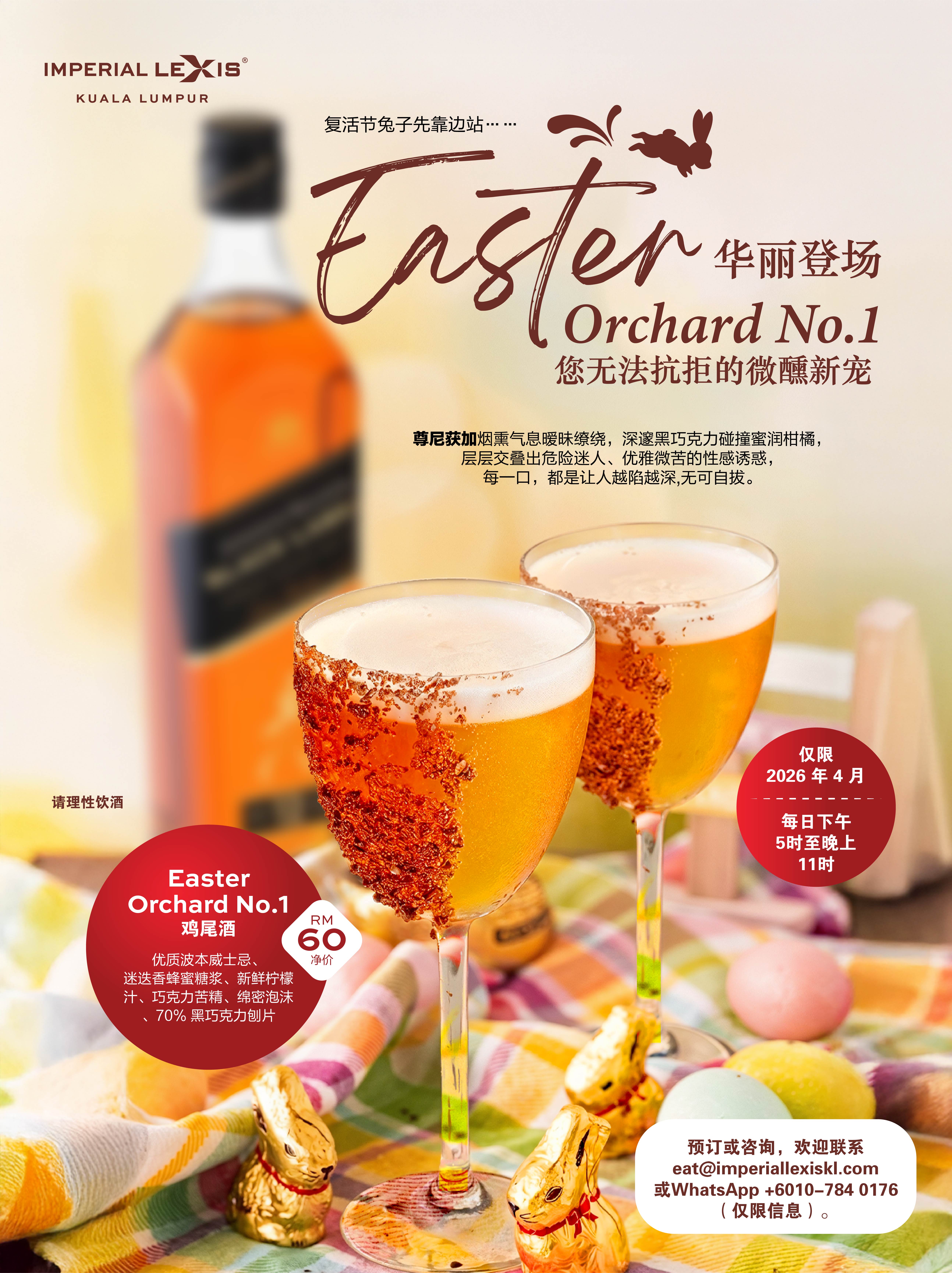 这个复活节,先别急着追随复活节兔子,因为吉隆坡帝国豪华酒店真正令人着迷的主角,是 Easter Orchard No.1。这款季节限定鸡尾酒将于 2026年4月,在 五十一盛宴 与 卫星餐厅与酒吧 限时供应。以优质尊尼获加、迷迭香蜂蜜糖浆、新鲜柠檬汁、巧克力苦精、绵密泡沫及 70% 黑巧克力刨片 精心调制,交织出烟熏气息、黑巧克力的深邃浓郁,以及蜜润柑橘的细腻清香,在优雅微苦中展现令人难以抗拒的迷人层次。每杯净价 RM60。
