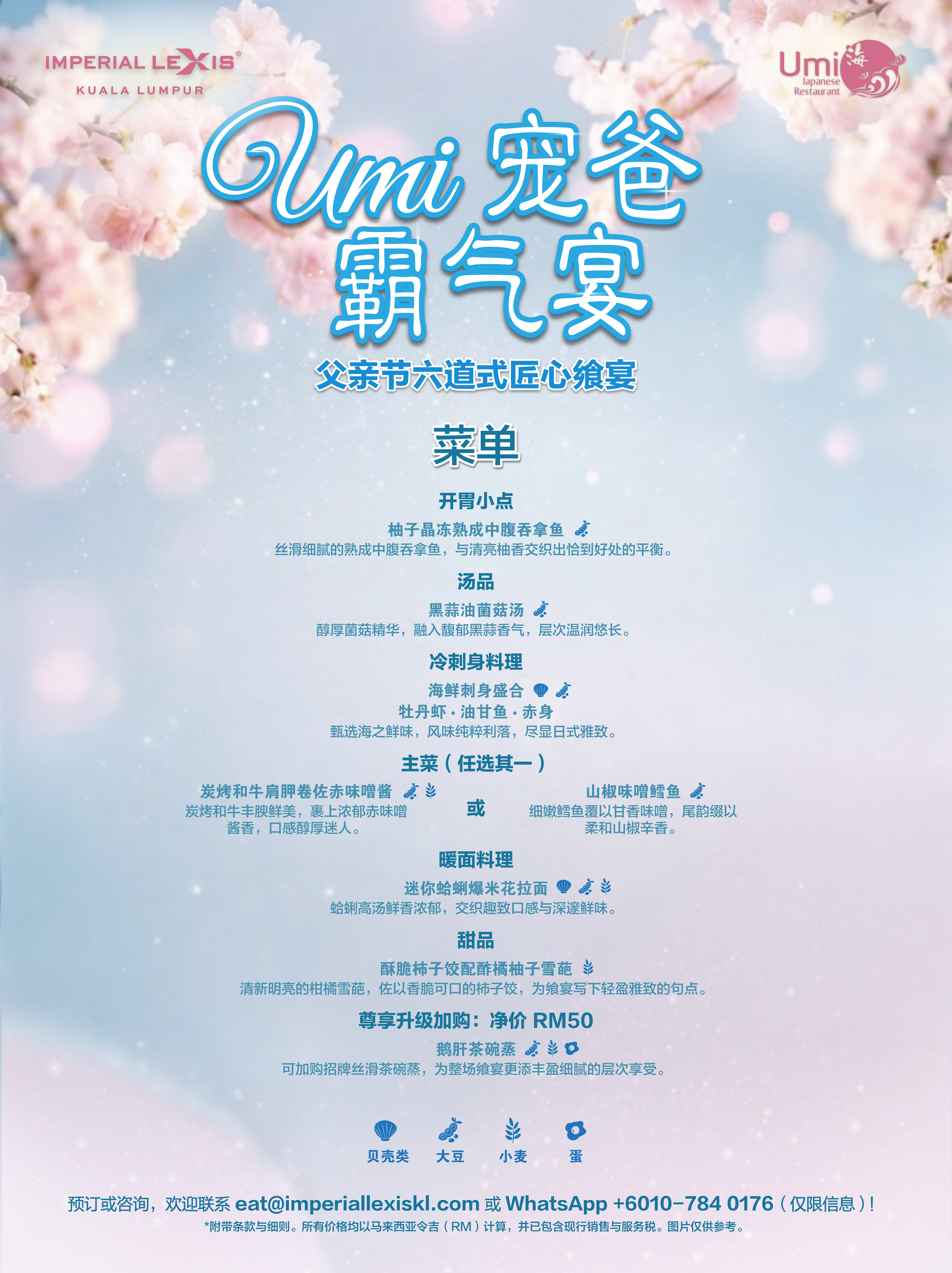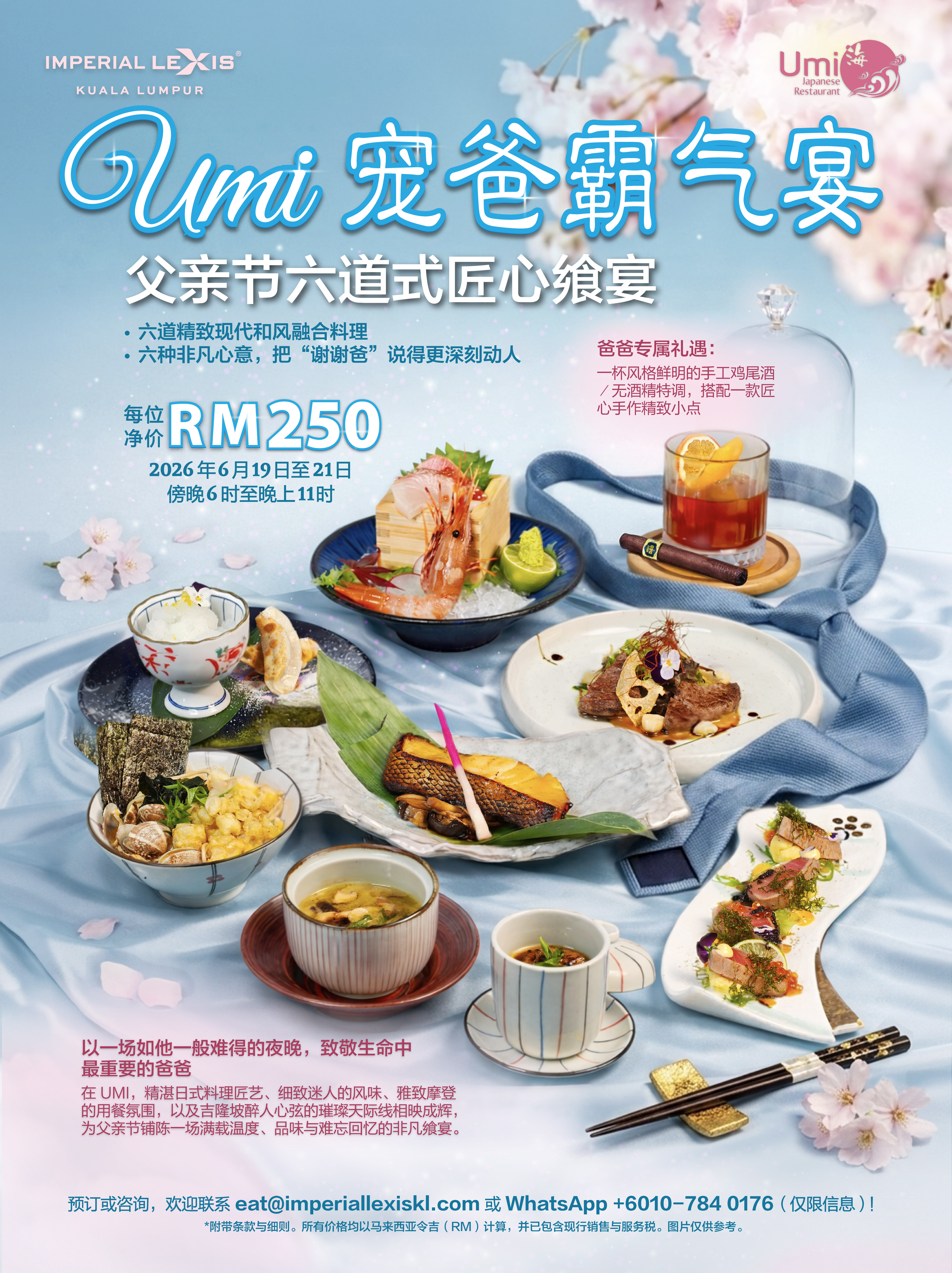 每位净价 RM250,并附赠爸爸专属手工鸡尾酒或无酒精特调一杯,以及精致小点一份。这个父亲节,就以一场非凡飨宴,向爸爸表达最深的谢意。立即电邮至 eat@imperiallexiskl.com 或 WhatsApp +6010-784 0176(仅限信息)预订。