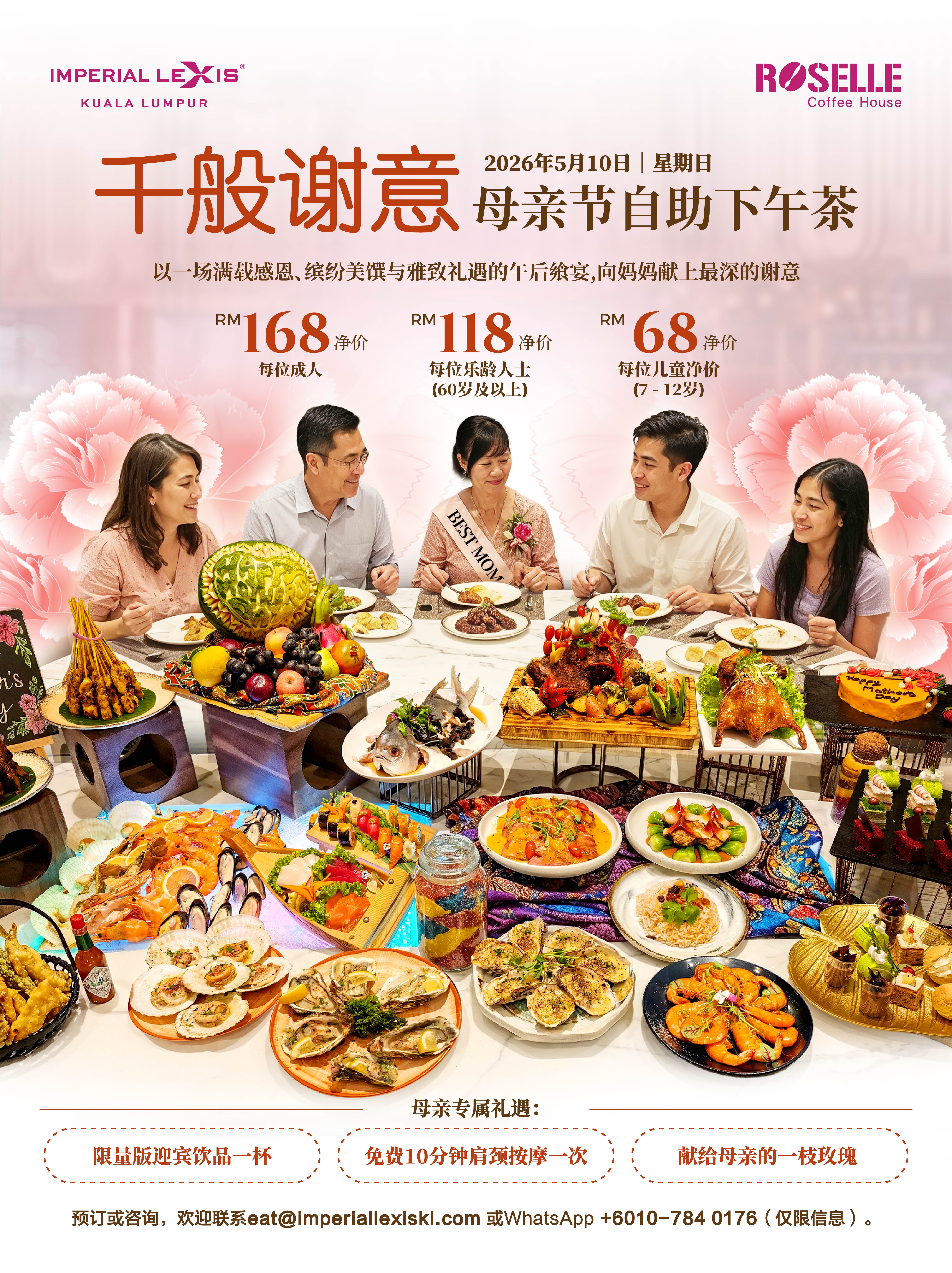 这个母亲节,诚邀您与家人齐聚吉隆坡帝国豪华酒店 大红花餐厅,以一场满载爱意、感恩与精致美馔的自助下午茶,向家中最伟大的她献上最真挚的谢意。“千般谢意自助下午茶” 不仅呈献丰盛诱人的国际风味飨宴,更为每位母亲悉心准备限量版迎宾饮品一杯、免费肩颈按摩一次,以及一枝玫瑰,让每一口美味、每一份礼遇、每一个温柔瞬间,都替您细诉对妈妈的深深感激与爱意。