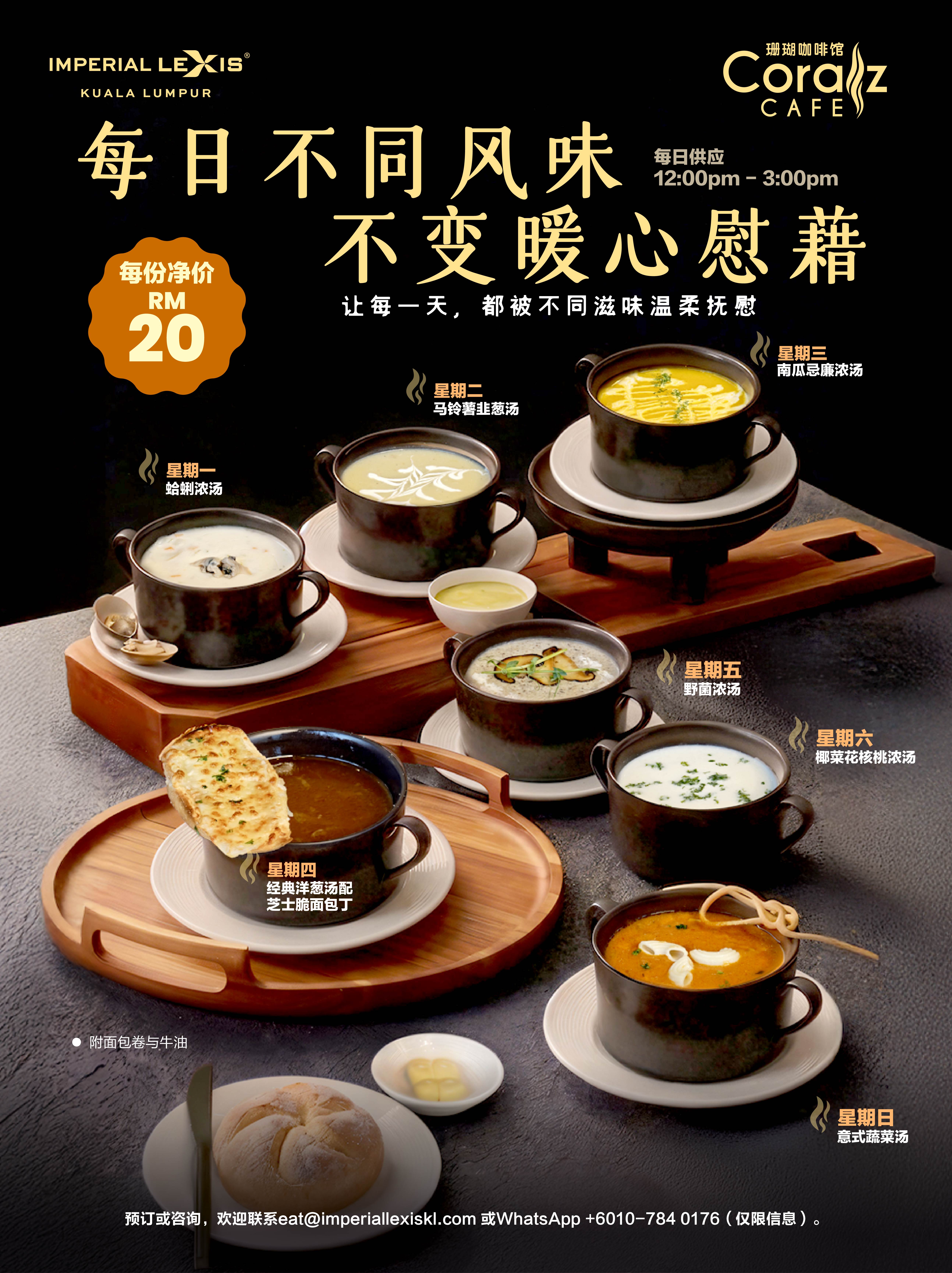 在 吉隆坡帝国豪华酒店 的 珊瑚咖啡厅,让一碗暖汤为您的午间时光添上一份舒心慰藉。每日轮换呈献的 每日汤品,从周一的蛤蜊浓汤到周日的意式蔬菜汤,每一天都有不同风味,温柔抚慰您的味蕾与心情。每份套餐附面包卷与牛油,以恰到好处的暖意,带来更满足的享受。每份仅需 RM20 净价,无论您钟情浓郁醇厚,还是偏爱清新细腻,总有一款值得您明天再来品尝。每日中午 12:00 至下午 3:00 供应。 地点: 底楼, 珊瑚咖啡厅 时段: 每日供应 12:00pm – 3:00pm 欲知详情或订座: WhatsApp | 电邮我们 *附加适用条款和条件。