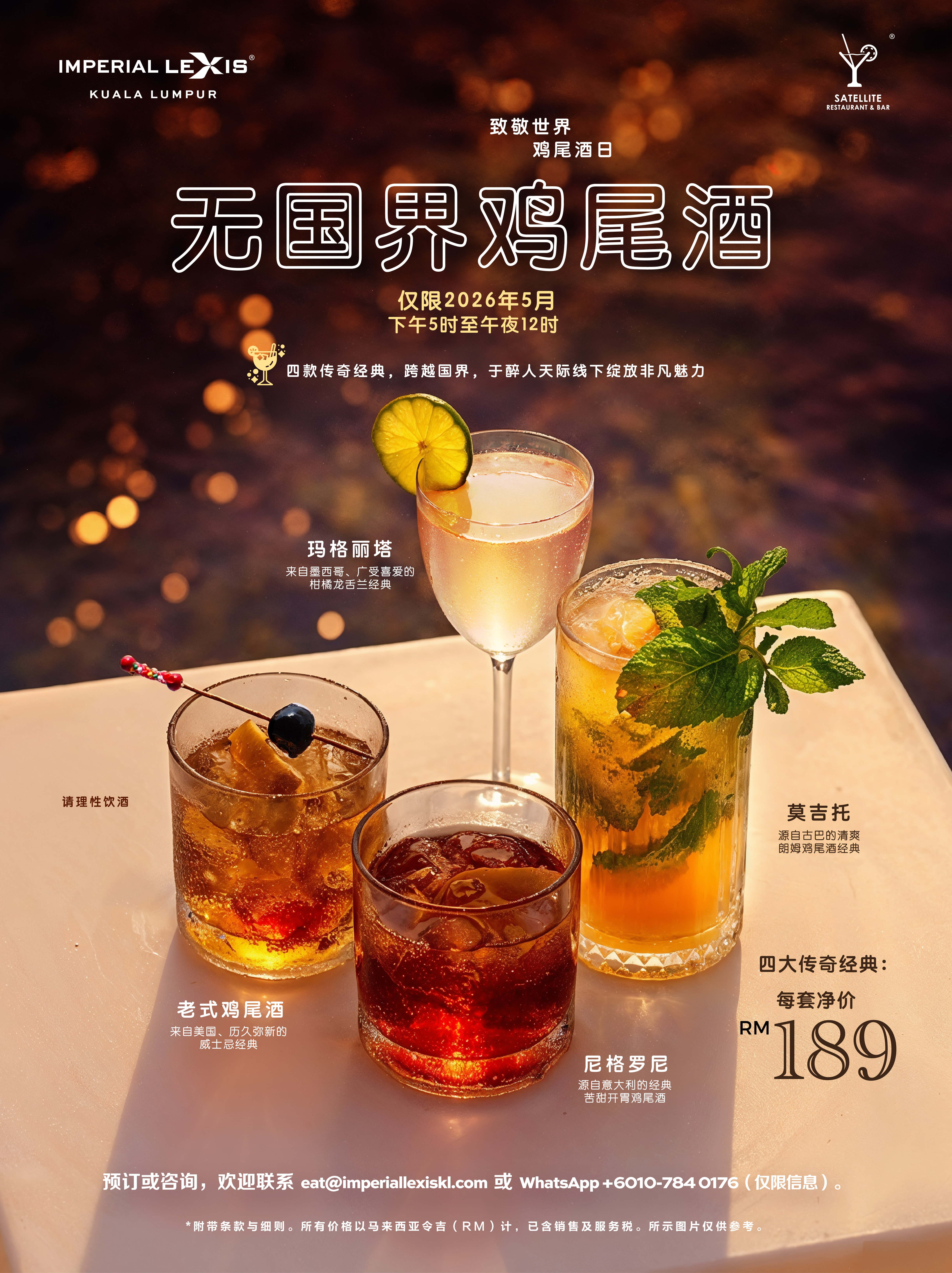 这个世界鸡尾酒日,诚邀您莅临吉隆坡帝国豪华酒店顶楼的卫星餐厅与酒吧,在迷人天际线下开启一场微醺而奢雅的经典之旅。“无国界鸡尾酒”一次汇聚四款享誉全球的传奇之作——苦甜迷人的尼格罗尼、鲜活明快的玛格丽塔、清新沁爽的莫吉托,以及醇厚隽永的老式鸡尾酒。 2026年5月,每日下午5时至午夜12时,净价RM189 即可尊享整套组合。与挚友举杯,在夜色、城景与酒香交织之间,沉醉于一场跨越国界的经典碰撞。 地点: 第53层楼, 卫星餐厅和酒吧 日期: 仅限2026年5月 | 下午 5时 至 午夜 12时 欲知详情或订座: WhatsApp | 电邮我们 *附加适用条款和条件。